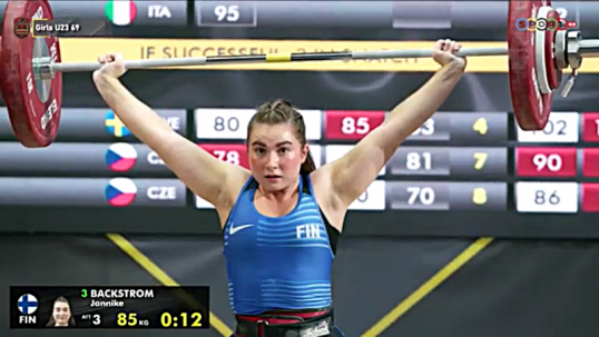 Rovaniemen Reippaan Jannike Bäckström sijoittui 12:nneksi 1. marraskuuta Albanian Dürresissa jatkuneissa painonnoston 20- ja 23-vuotiaiden Euroopan mestaruuskilpailuissa. 23-vuotiaiden sarjassa 69 kiloa nostanut Bäckström tehtaili yhteistuloksen 189 kiloa, joka koostui 85 kilon tempauksesta ja 104 kilon työnnöstä.
